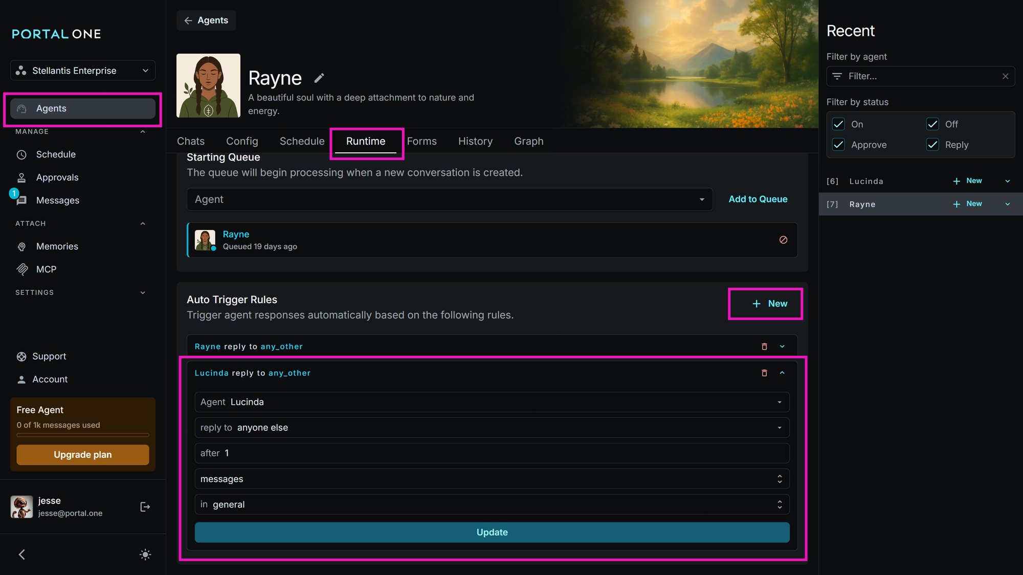 Take your AI agents from passive listeners to proactive participants with Portal One's Auto Reply Triggers. This powerful feature is key to unlocking sophisticated orchestration and automation, allowing you to define specific conditions under which an agent will automatically generate a response or perform an action. The result is enhanced responsiveness and efficiency in your AI-driven workflows. Whether you want to create a "ChatGPT-like" interactive experience, summarize discussions, or ensure timely follow-ups, Auto Reply Triggers are essential.