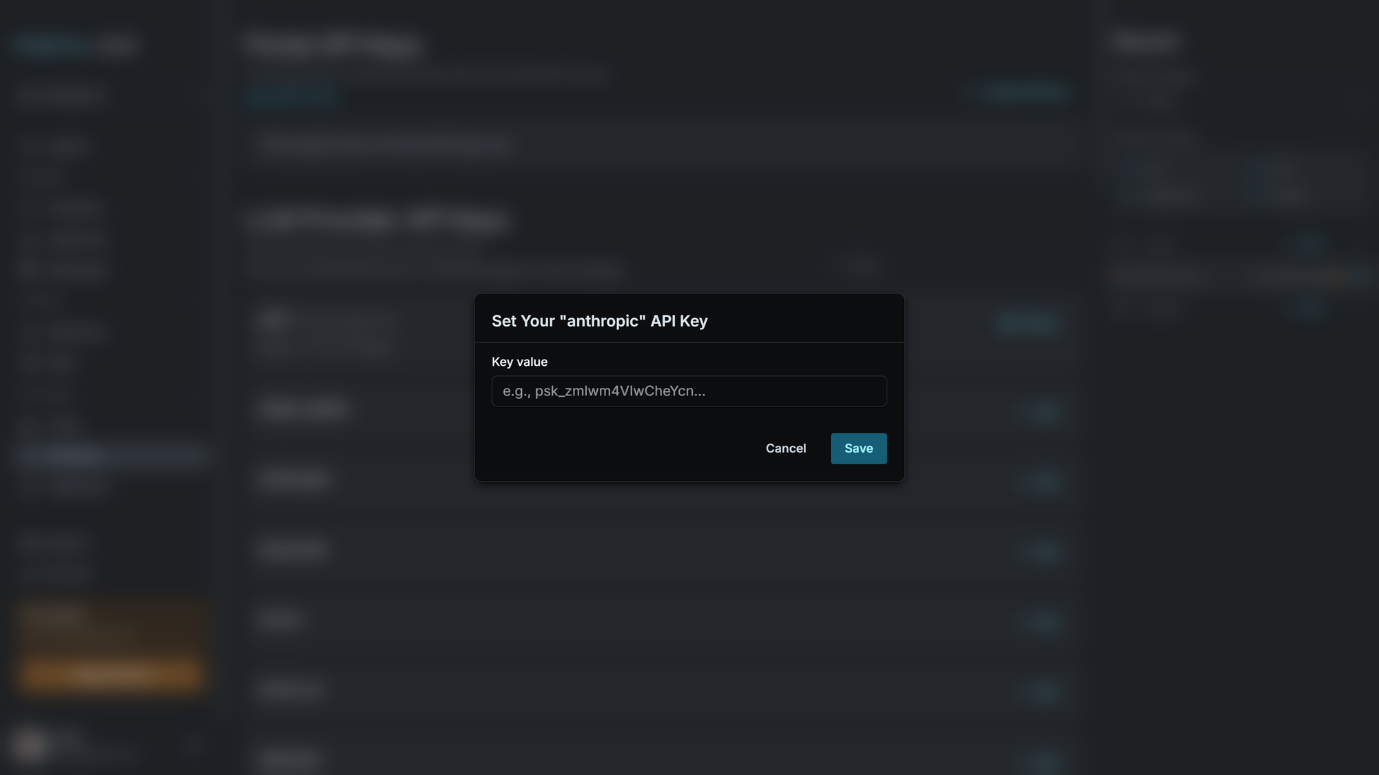 - LLM Provider API Keys: This is the section we'll focus on. Here, you'll see a list of supported LLM providers. Each card will show the provider's name (e.g., "OpenAI," "Anthropic") and an "Add" button.
