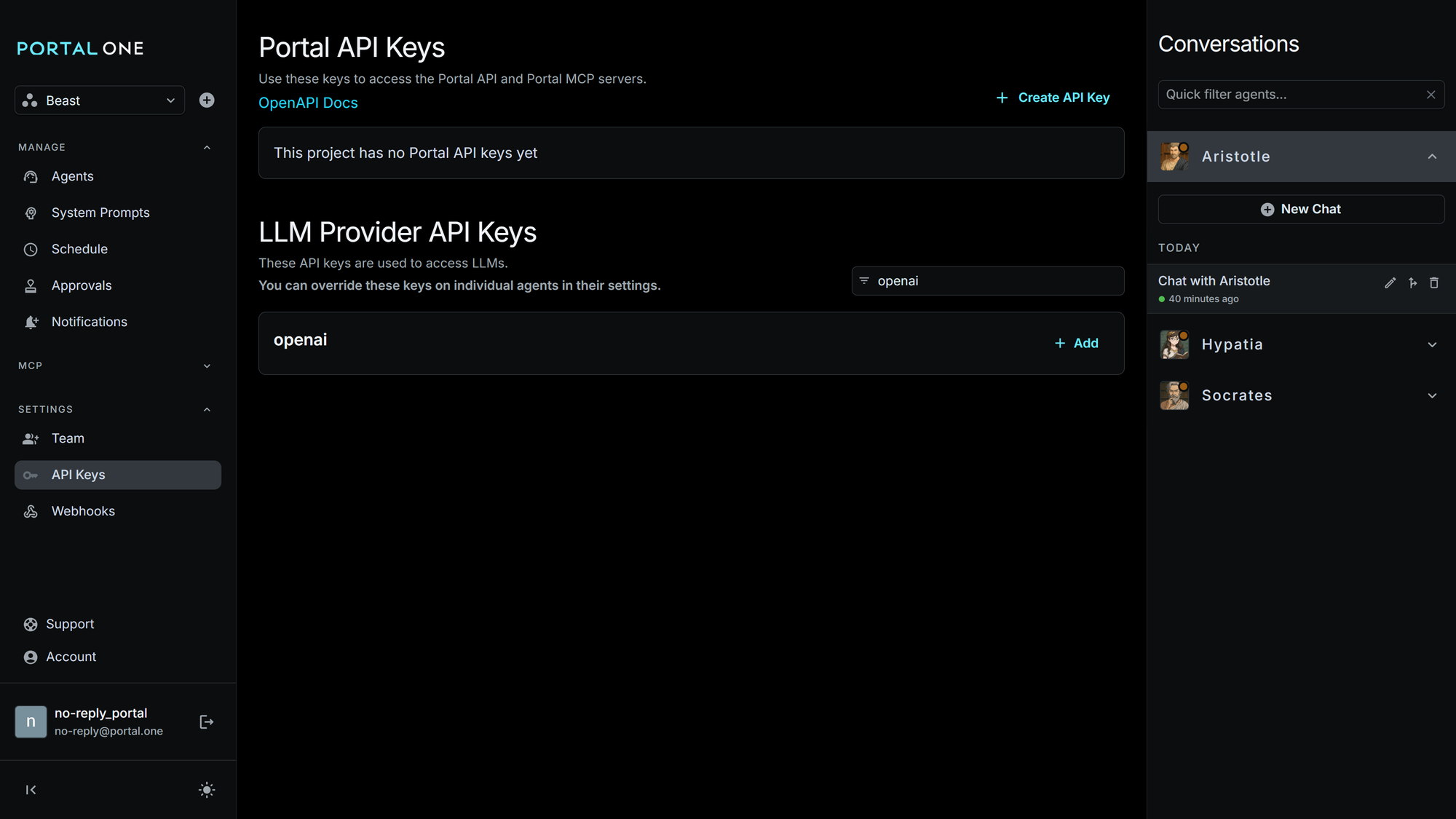 Note: Portal One simplifies this process by focusing on the API key itself. Other configurations, such as selecting specific models (e.g., gpt-4-turbo or claude-3-opus), are handled when you configure individual AI agents, not at this API key connection stage.