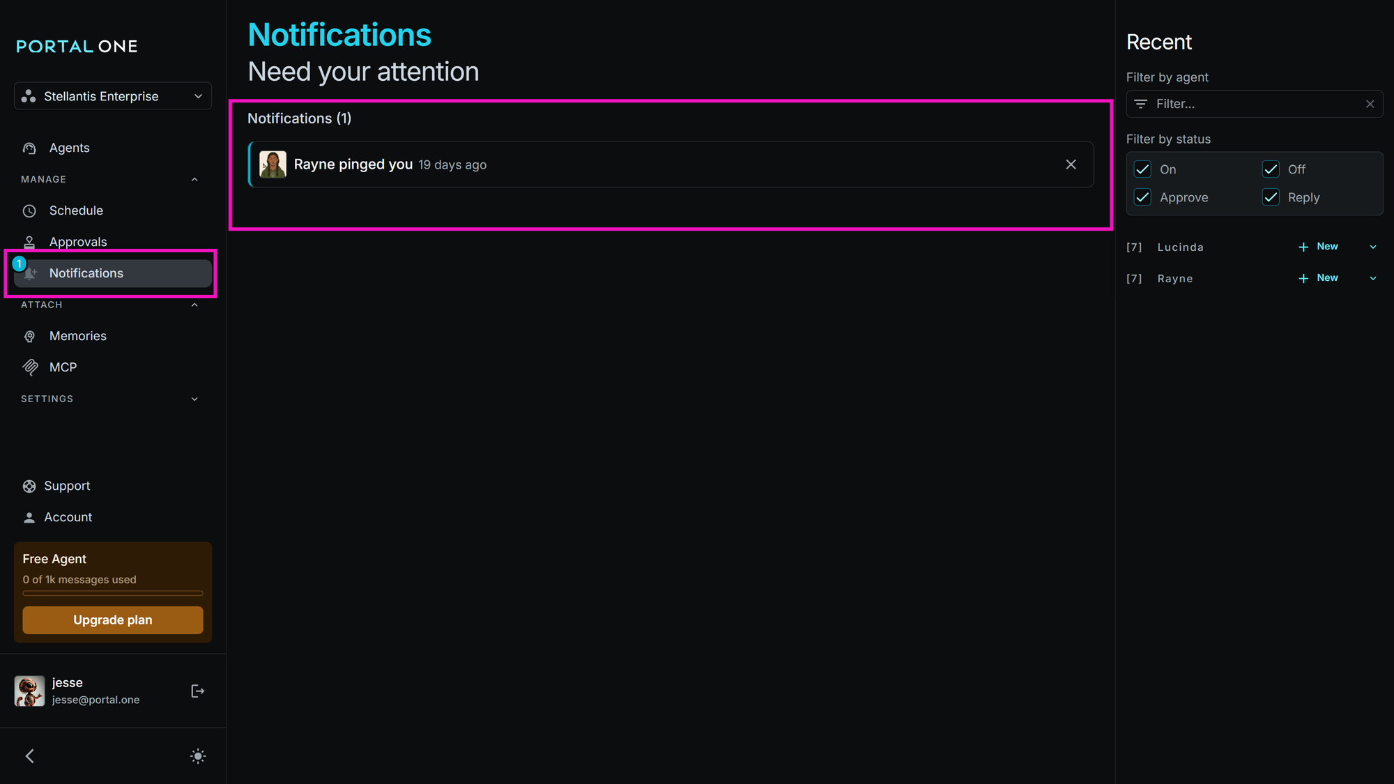 Portal One agents can get your attention when they need your input or have an update by sending you a Notification. These Notifications appear in a dedicated "Notifications" view, prompting you to check the originating conversation with the agent.